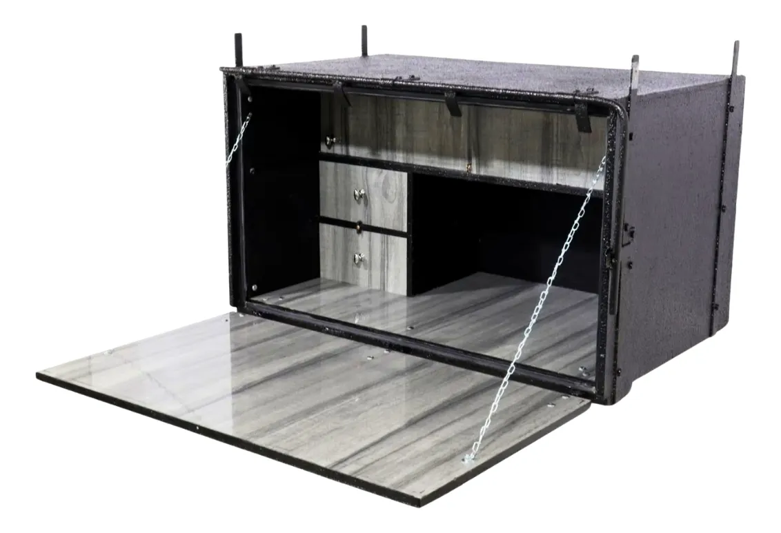 CAIXA DE COZINHA Para Todos os tipos de veículos Madeira: Compensado Naval 19mm; Acabamento: Emborrachado, com pintura em esmalte sintético; Fórmica: Produto diferenciado com apelo em inovação em sustentabilidade, saúde e bem-estar.